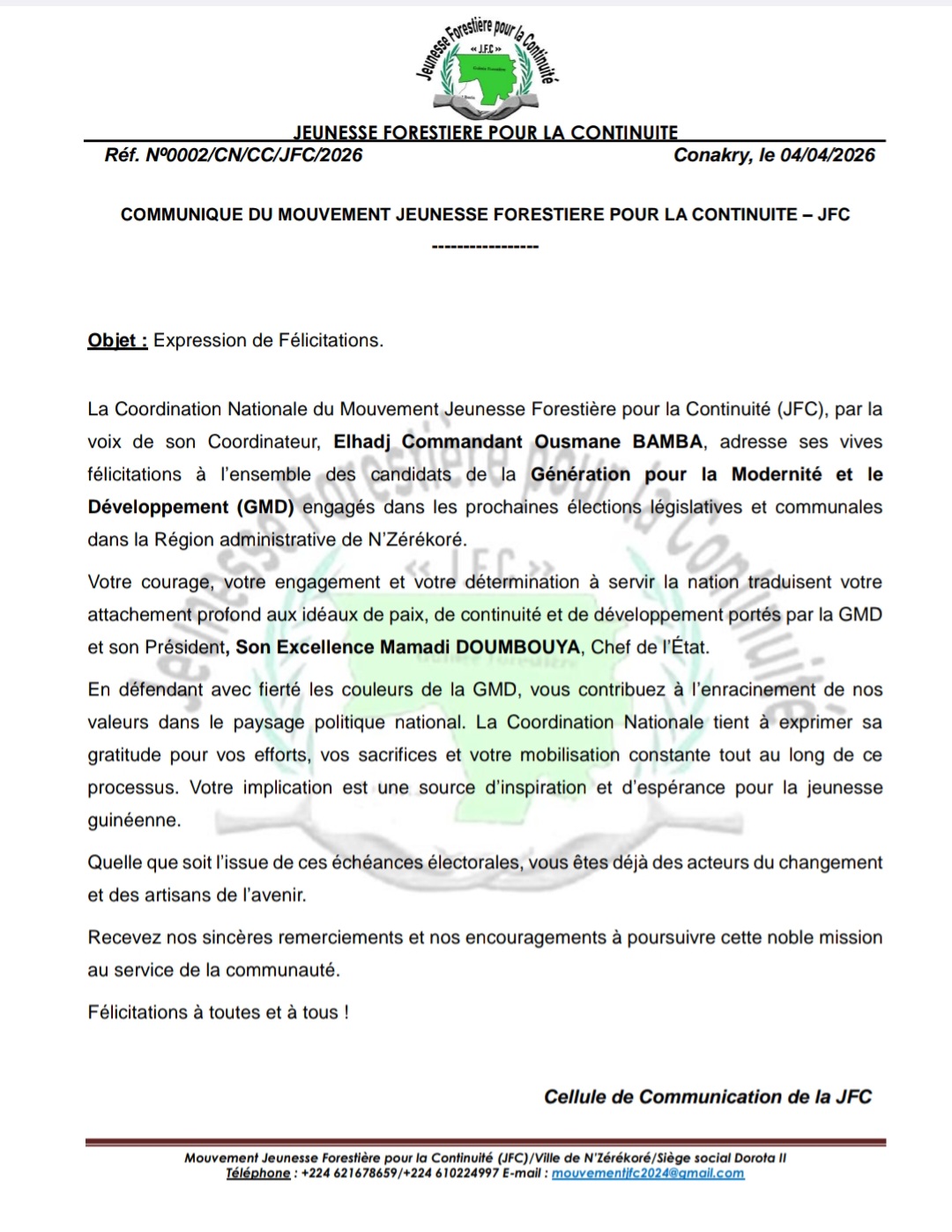 La Coordination Nationale du Mouvement Jeunesse Forestière pour la Continuité (JFC), par la voix de son Coordinateur, Elhadj Commandant Ousmane BAMBA, adresse ses vives félicitations à l’ensemble des candidats de la Génération pour la Modernité et le Développement (GMD) engagés dans les prochaines élections législatives et communales dans la Région administrative de N’Zérékoré.