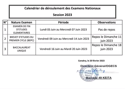 Ce 21 févier, le ministère de l’Enseignement pré-univrrsitaire et de l’alphabétisation a dévoilé le calendrier du déroulement des examens nationaux session 2023. Ils se dérouleront du lundi 5 juin au mardi 20 juin sur toute l’étendue du territoire national.